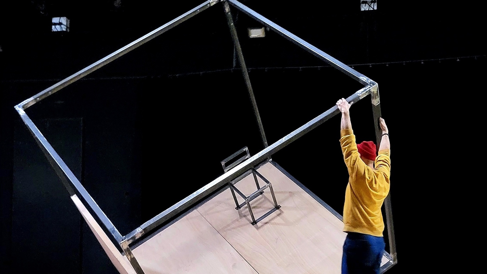 C’est un cadre mobile, instable, parfois habitat, parfois obstacle, dans lequel les corps évoluent. Les interprètes passent tour à tour d’artistes à technicien.nes visibles, en mouvement ou immobile, brouillant sans cesse les lignes de rôle.